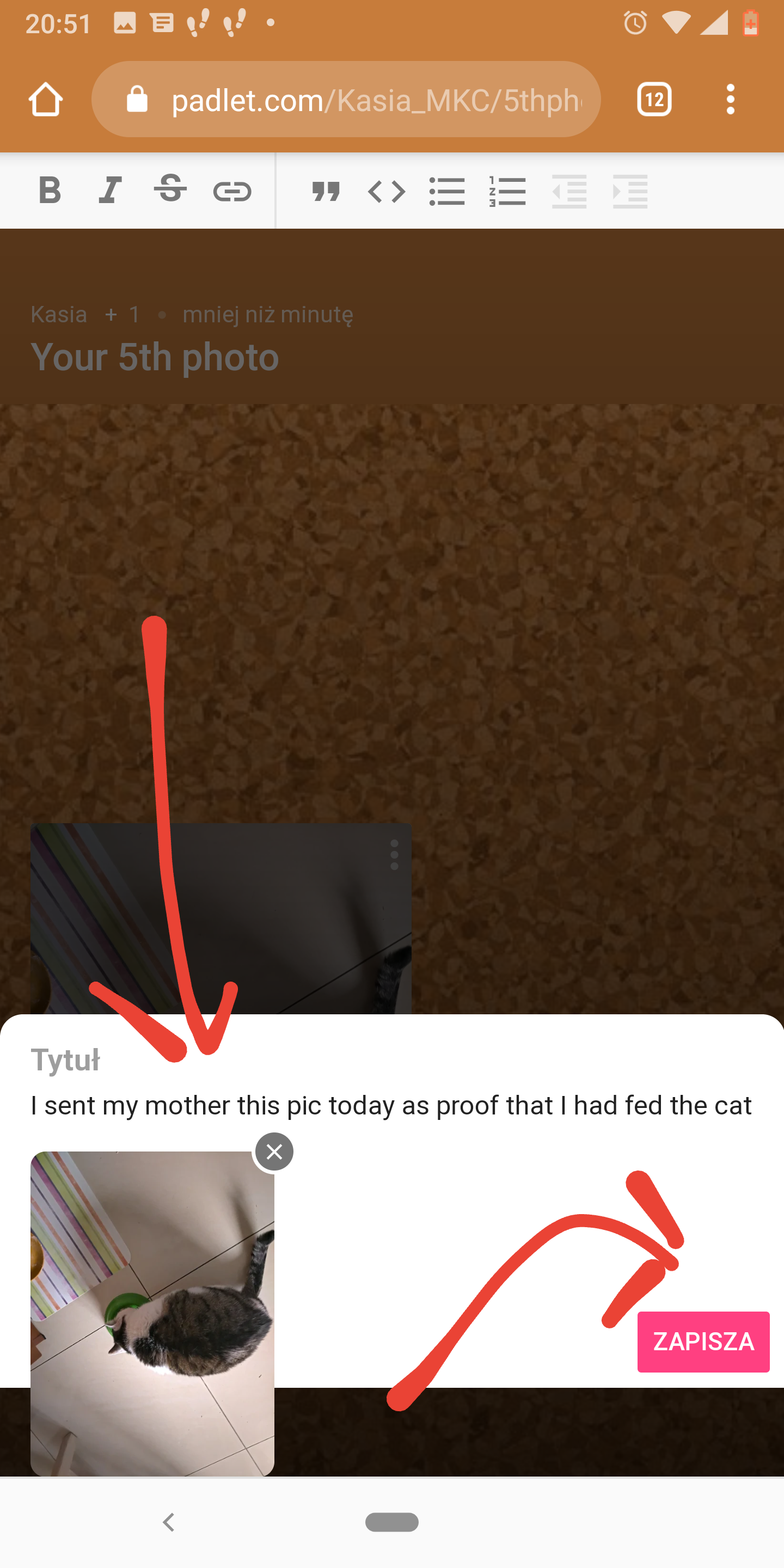Jeśli zmieniasz starego padleta, dodaj odpowiedni tytuł, np: your fifth photo (1) Następnie zapisz instrukcję dla uczniów (2).